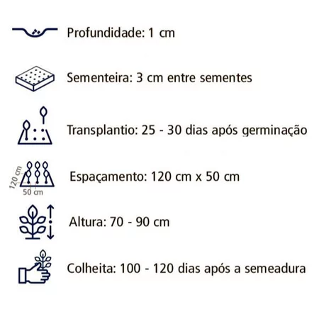 Revolva o solo no mínimo 20 cm de profundidade até que fique solto, sem a presença de torrões. Para melhorar o solo, adicione esterco e/ou húmus na proporção de 10%. Misture adubo balanceado NPK considerando 300g para cada 10m2 de canteiro. Para plantio em vasos, use substrato e adicione 5g de adubo por litro de vaso. Semeie conforme a tabela ao lado. Após o plantio, manter o solo e/ou substrato úmido, sem encharcar, para obter melhores resultados.